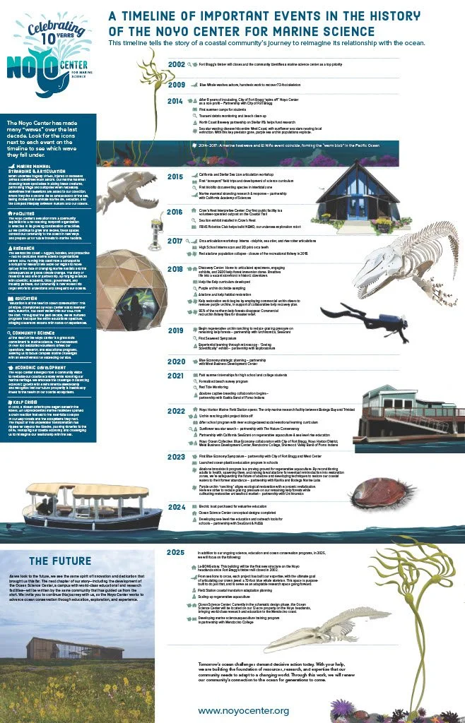 The Noyo Center was born in the salt spray of the Mendocino Coast, when a small community reimagined a thriving future for itself, the surrounding ecology, and the regional economy. In 2002, the closure of the lumber mill on the Noyo Headlands in Fort Bragg—after over a century of operation— represented an opportunity for the region to shift from an extractive to a restorative economy and to reconnect the people of California to one of the most rugged, beautiful and productive coastlines in the world. Noyo Center was founded in 2014 to be a world-class marine science center dedicated to education, science, and the regeneration of both natural ecosystems and the regional economy. In its first decade, the Noyo Center has responded to crisis and opportunity by growing in scope and capacity, stepping into its role as a recognized regional leader.