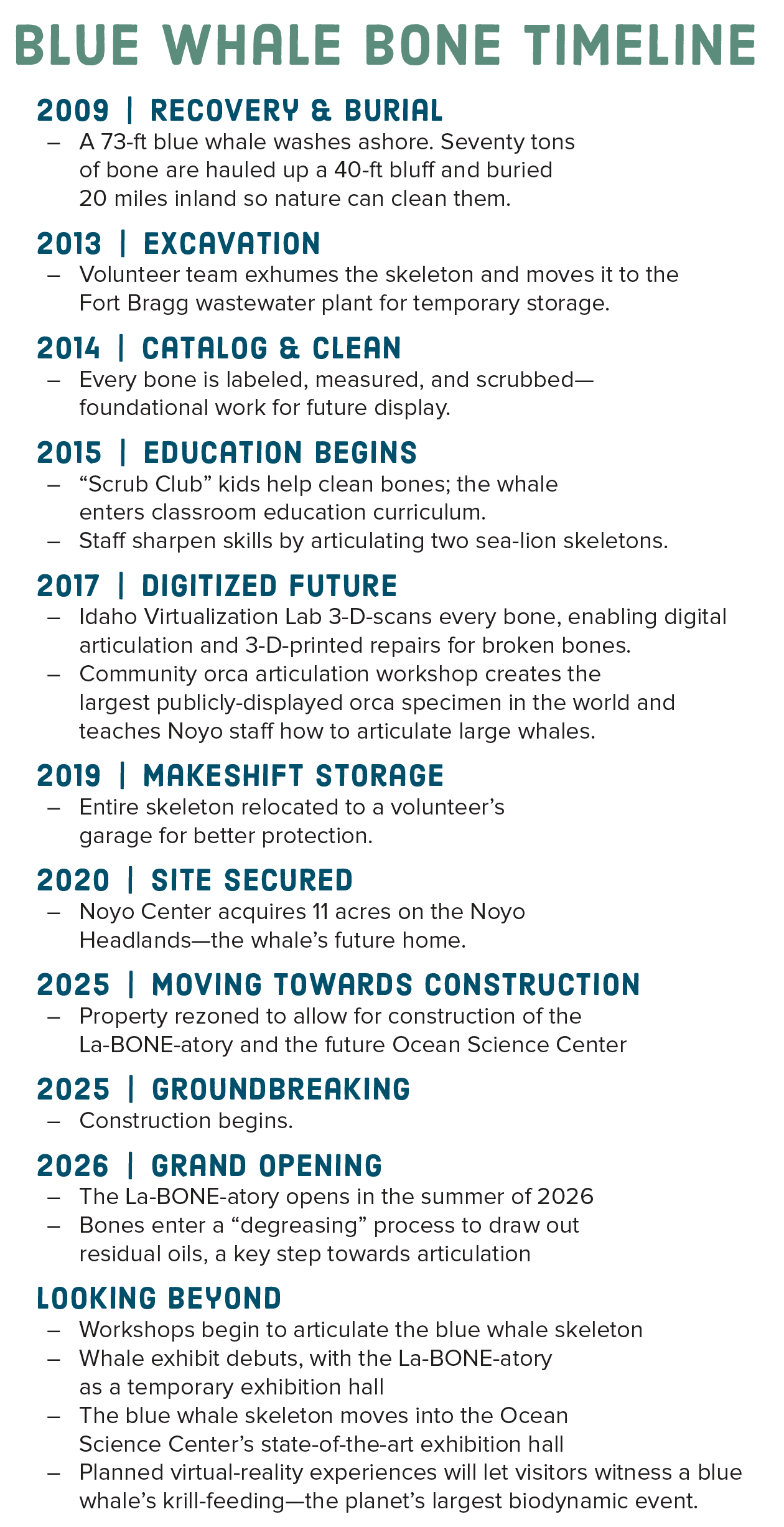 Our dream is to turn our blue whale bones into a world-class exhibit that will represent the Noyo Center’s vision to: